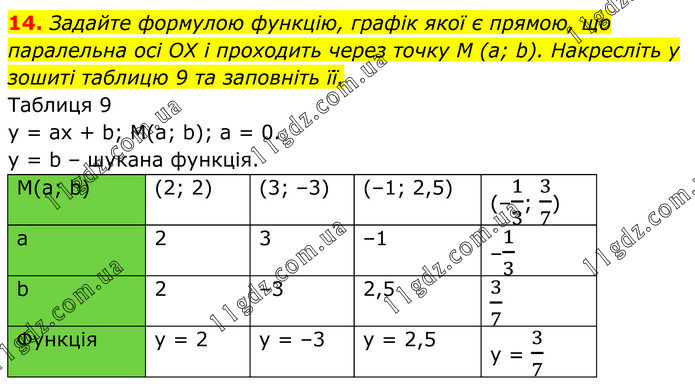 Задайте формулою функцію, графік якої є прямою, що паралельна осі OX і проходить через точку M (а; b). Накресліть у зошиті таблицю 9 та заповніть її. Таблиця 9 y = ax + b; M(a; b); a = 0. y = b – шукана функція.