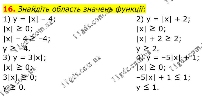 Знайдіть область значень функції: 1) у = |x| – 4; |x| ≥ 0; |x| – 4 ≥ –4; y ≥ –4. 3) y = 3|x|; |x| ≥ 0; 3|x| ≥ 0; y ≥ 0. 2) y = |x| + 2; |x| ≥ 0; |x| + 2 ≥ 2; y ≥ 2. 4) y = –5|x| + 1; |x| ≥ 0; –5|x| + 1 ≤ 1; y ≤ 1.