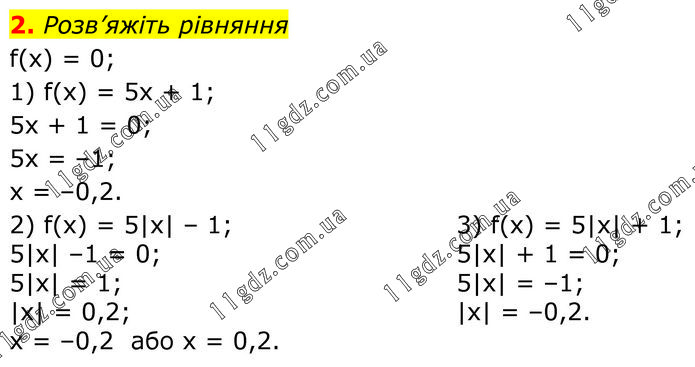 Розв’яжіть рівняння f(x) = 0; 1) f(x) = 5x + 1; 5x + 1 = 0; 5x = –1; x = –0,2. 2) f(x) = 5|x| – 1; 5|x| –1 = 0; 5|x| = 1; |x| = 0,2; x = –0,2 або x = 0,2. 3) f(x) = 5|x| + 1; 5|x| + 1 = 0; 5|x| = –1; |x| = –0,2.