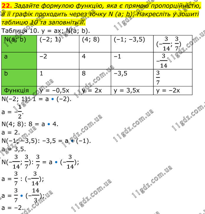 Задайте формулою функцію, яка є прямою пропорційністю, а її графік проходить через точку N (а; b). Накресліть у зошиті таблицю 10 та заповніть її. Таблиця 10. y = ax; N(a; b). N(–2; 1): 1 = a • (–2). a = –1/2. N(4; 8): 8 = a • 4. a = 2. N(–1; –3,5): –3,5 = a • (–1). a = 3,5. N(–3/14; 3/7): 3/7 = a • (–3/14); a = 3/7 : (–3/14); a = 3/7 • (–14/3); a = –2.