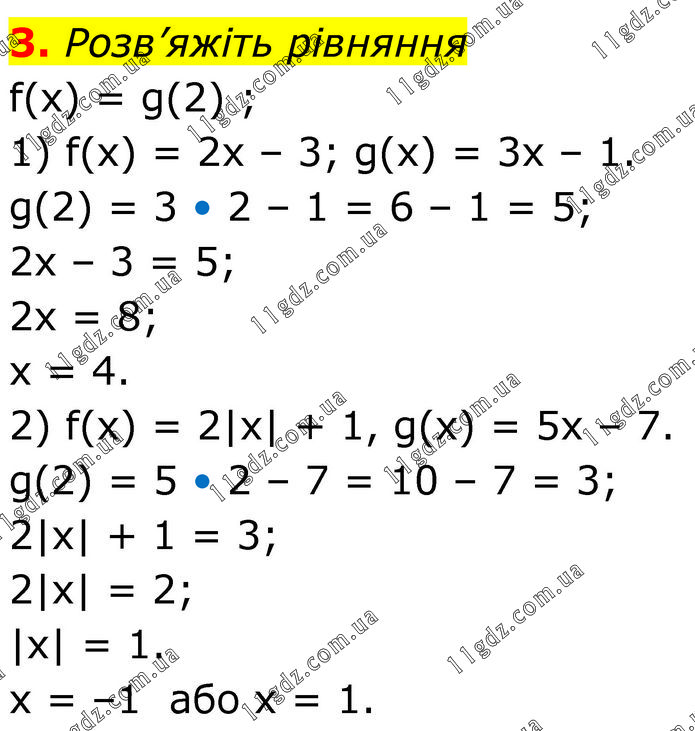 Розв’яжіть рівняння f(x) = g(2) ; 1) f(x) = 2x – 3; g(x) = 3x – 1. g(2) = 3 • 2 – 1 = 6 – 1 = 5; 2x – 3 = 5; 2x = 8; x = 4. 2) f(x) = 2|x| + 1, g(x) = 5x – 7. g(2) = 5 • 2 – 7 = 10 – 7 = 3; 2|x| + 1 = 3; 2|x| = 2; |x| = 1. x = –1 або x = 1.