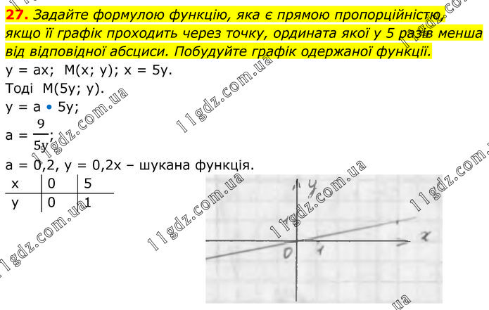 Задайте формулою функцію, яка є прямою пропорційністю, якщо її графік проходить через точку, ордината якої у 5 разів менша від відповідної абсциси. Побудуйте графік одержаної функції. у = ах; М(х; у); х = 5у. Тоді М(5у; у). у = а • 5у; а = 9/5у; а = 0,2, у = 0,2х – шукана функція.