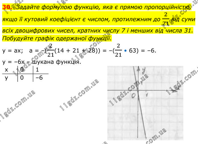 Задайте формулою функцію, яка є прямою пропорційністю, якщо її кутовий коефіцієнт є числом, протилежним до 2/21 від суми всіх двоцифрових чисел, кратних числу 7 і менших від числа 31. Побудуйте графік одержаної функції. у = ах; а = –(2/21(14 + 21 + 28)) = –(2/21 • 63) = –6. у = –6х – шукана функція.