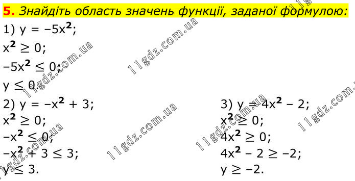 Знайдіть область значень функції, заданої формулою: 1) y = –5x2; x2 ≥ 0; –5x2 ≤ 0; y ≤ 0. 2) y = –x2 + 3; x2 ≥ 0; –x2 ≤ 0; –x2 + 3 ≤ 3; y ≤ 3. 3) y = 4x2 – 2; x2 ≥ 0; 4x2 ≥ 0; 4x2 – 2 ≥ –2; y ≥ –2.