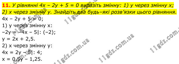 У рівнянні 4х – 2у + 5 = 0 виразіть змінну: 1) у через змінну х; 2) х через змінну у. Знайдіть два будь–які розв’язки цього рівняння. 4x – 2y + 5 = 0; 1) у через змінну х: –2у = –4х – 5|: (–2); y = 2x + 2,5. 2) x через змінну у: 4х = 2у – 5|: 4; x = 0,5y – 1,25.