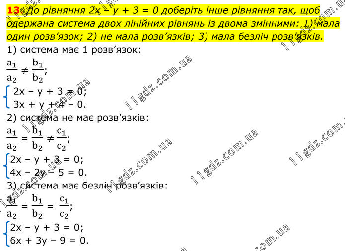 До рівняння 2х – у + 3 = 0 доберіть інше рівняння так, щоб одержана система двох лінійних рівнянь із двома змінними: 1) мала один розв’язок; 2) не мала розв’язків; 3) мала безліч розв’язків. 1) система має 1 розв’язок: а_1/a_2 ≠ b_1/b_2 ; 2x – y + 3 = 0; 3x + y + 4 – 0. 2) cистема не має розв’язків: а_1/a_2 = b_1/b_2 ≠ с_1/с_2 ; 2x – y + 3 = 0; 4x – 2y – 5 = 0. 3) cистема має безліч розв’язків: а_1/a_2 = b_1/b_2 = с_1/с_2 ; 2x – y + 3 = 0; 6x + 3y – 9 = 0.