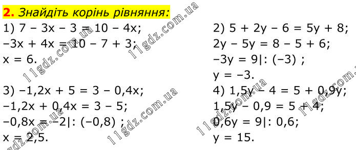 Знайдіть корінь рівняння: 1) 7 – 3х – 3 = 10 – 4х; –3х + 4х = 10 – 7 + 3; х = 6. 2) 5 + 2у – 6 = 5у + 8; 2у – 5у = 8 – 5 + 6; –3у = 9|: (–3) ; y = –3. 3) –1,2x + 5 = 3 – 0,4x; –1,2x + 0,4x = 3 – 5; –0,8x = –2|: (–0,8) ; x = 2,5. 4) 1,5y – 4 = 5 + 0,9y; 1,5y – 0,9 = 5 + 4; 0,6y = 9|: 0,6; y = 15.