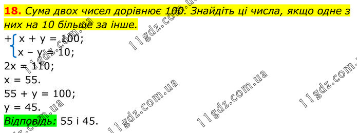 Сума двох чисел дорівнює 100. Знайдіть ці числа, якщо одне з них на 10 більше за інше. + х + у = 100; х – у = 10; 2х = 110; х = 55. 55 + у = 100; у = 45. Відповідь: 55 і 45.