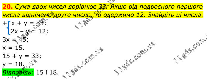 Сума двох чисел дорівнює 33. Якщо від подвоєного першого числа віднімемо друге число, то одержимо 12. Знайдіть ці числа. + х + у = 33; 2х – у = 12; 3х = 45; х = 15. 15 + у = 33; у = 18. Відповідь: 15 і 18.