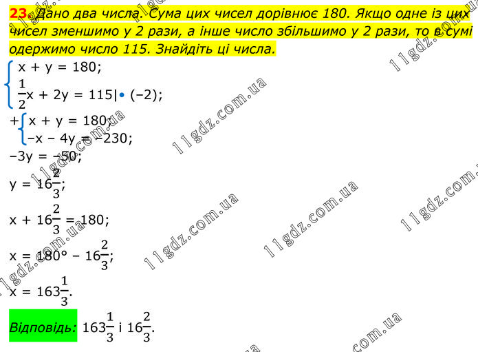 Дано два числа. Сума цих чисел дорівнює 180. Якщо одне із цих чисел зменшимо у 2 рази, а інше число збільшимо у 2 рази, то в сумі одержимо число 115. Знайдіть ці числа. х + у = 180; 1/2х + 2у = 115|• (–2); + х + у = 180; –х – 4у = –230; –3у = –50; у = 162/3; х + 162/3 = 180; х = 180° – 162/3; х = 1631/3. Відповідь: 1631/3 і 162/3.