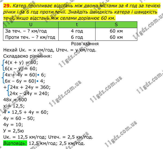 Катер пропливає відстань між двома містами за 4 год за течією річки і за 6 год проти течії. Знайдіть швидкість катера і швидкість течії, якщо відстань між селами дорівнює 60 км. Розв'язання Нехай Uк. = х км/год, Uтеч. = у км/год. Складаємо рівняння: 4(х + у) = 60; 6(х – у) = 60; 4х + 4у = 60|• 6; 6х – 6у = 60|• 4; + 24х + 24у = 360; 24х – 24у = 240; 48х = 600 х = 12,5; 4 • 12,5 + 4у = 60; 4у = 60 – 50; 4у = 10; У = 2,5ю Uк. = 12,5 км/год; Uтеч. = 2,5 км/год. Відповідь: 12,5 км/год; 2,5 км/год.