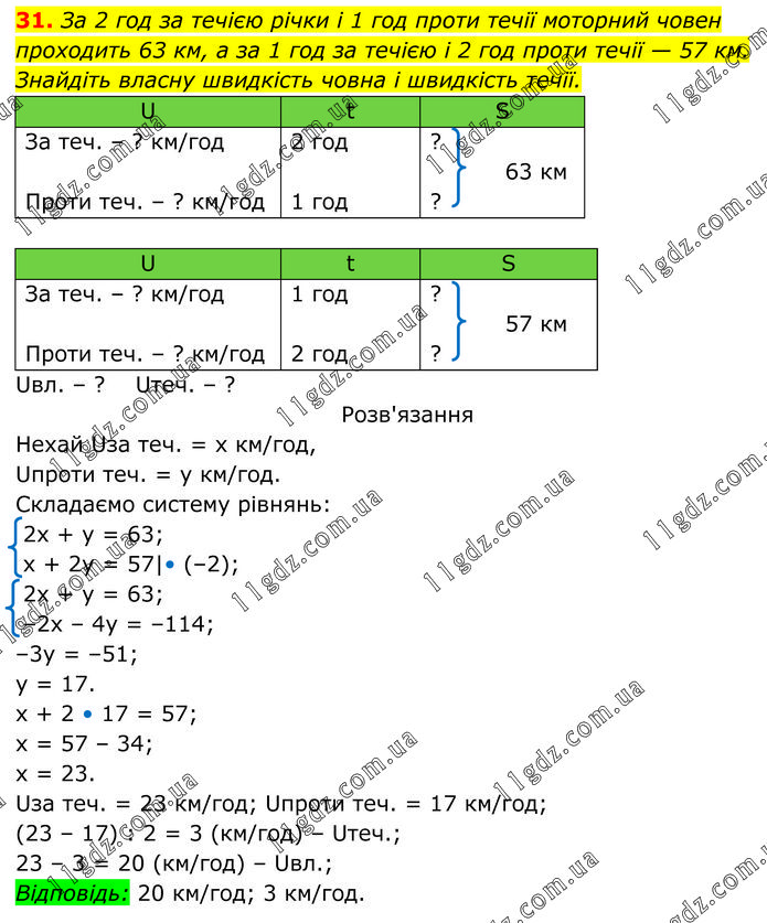 За 2 год за течією річки і 1 год проти течії моторний човен проходить 63 км, а за 1 год за течією і 2 год проти течії — 57 км. Знайдіть власну швидкість човна і швидкість течії. Розв'язання Нехай Uза теч. = х км/год, Uпроти теч. = у км/год. Складаємо систему рівнянь: 2х + у = 63; х + 2у = 57|• (–2); 2х + у = 63; –2х – 4у = –114; –3у = –51; у = 17. х + 2 • 17 = 57; х = 57 – 34; х = 23. Uза теч. = 23 км/год; Uпроти теч. = 17 км/год; (23 – 17) : 2 = 3 (км/год) – Uтеч.; 23 – 3 = 20 (км/год) – Uвл.; Відповідь: 20 км/год; 3 км/год.