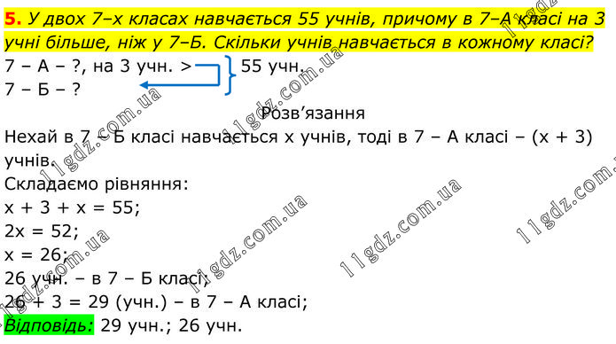 У двох 7–х класах навчається 55 учнів, причому в 7–А класі на 3 учні більше, ніж у 7–Б. Скільки учнів навчається в кожному класі? 7 – А – ?, на 3 учн. > 55 учн. 7 – Б – ? Розв’язання Нехай в 7 – Б класі навчається х учнів, тоді в 7 – А класі – (х + 3) учнів. Складаємо рівняння: х + 3 + х = 55; 2х = 52; х = 26; 26 учн. – в 7 – Б класі; 26 + 3 = 29 (учн.) – в 7 – А класі; Відповідь: 29 учн.; 26 учн.