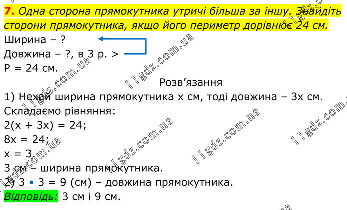 Одна сторона прямокутника утричі більша за іншу. Знайдіть сторони прямокутника, якщо його периметр дорівнює 24 см. Ширина – ? Довжина – ?, в 3 р. > Р = 24 см. Розв’язання 1) Нехай ширина прямокутника х см, тоді довжина – 3х см. Складаємо рівняння: 2(х + 3х) = 24; 8х = 24; х = 3. 3 см – ширина прямокутника. 2) 3 • 3 = 9 (см) – довжина прямокутника. Відповідь: 3 см і 9 см.