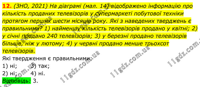 (ЗНО, 2021) На діаграмі (мал. 14) відображено інформацію про кількість проданих телевізорів у супермаркеті побутової техніки протягом перших шести місяців року. Які з наведених тверджень є правильними? 1) найменшу кількість телевізорів продано у квітні; 2) у січні продано 240 телевізорів; 3) у березні продано телевізорів більше, ніж у лютому; 4) у червні продано менше трьохсот телевізорів. Які твердження є правильними: 1) ні; 3) так; 2) ні; 4) ні. Відповідь: 3.