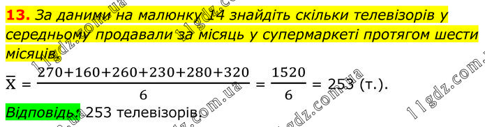 За даними на малюнку 14 знайдіть скільки телевізорів у середньому продавали за місяць у супермаркеті протягом шести місяців. х ̅ = (270+160+260+230+280+320)/6 = 1520/6 = 253 (т.). Відповідь: 253 телевізорів.