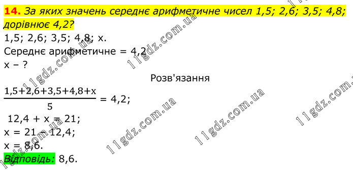 За яких значень середнє арифметичне чисел 1,5; 2,6; 3,5; 4,8; дорівнює 4,2? 1,5; 2,6; 3,5; 4,8; х. Середнє арифметичне = 4,2 х – ? Розв'язання (1,5+2,6+3,5+4,8+х)/5 = 4,2; 12,4 + x = 21; x = 21 – 12,4; x = 8,6. Відповідь: 8,6.
