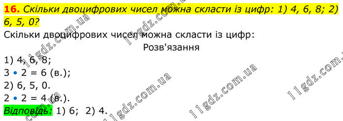 Скільки двоцифрових чисел можна скласти із цифр: 1) 4, 6, 8; 2) 6, 5, 0? Скільки двоцифрових чисел можна скласти із цифр: Розв'язання 1) 4, 6, 8; 3 • 2 = 6 (в.); 2) 6, 5, 0. 2 • 2 = 4 (в.). Відповідь: 1) 6; 2) 4.