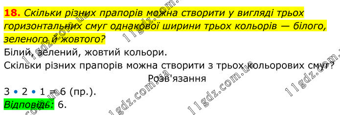 Скільки різних прапорів можна створити у вигляді трьох горизонтальних смуг однакової ширини трьох кольорів — білого, зеленого й жовтого? Білий, зелений, жовтий кольори. Скільки різних прапорів можна створити з трьох кольорових смуг? Розв'язання 3 • 2 • 1 = 6 (пр.). Відповідь: 6.