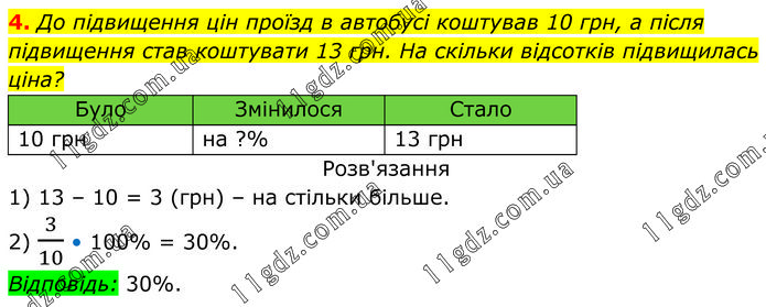 До підвищення цін проїзд в автобусі коштував 10 грн, а після підвищення став коштувати 13 грн. На скільки відсотків підвищилась ціна? Розв'язання 1) 13 – 10 = 3 (грн) – на стільки більше. 2) 3/10 • 100% = 30%. Відповідь: 30%.