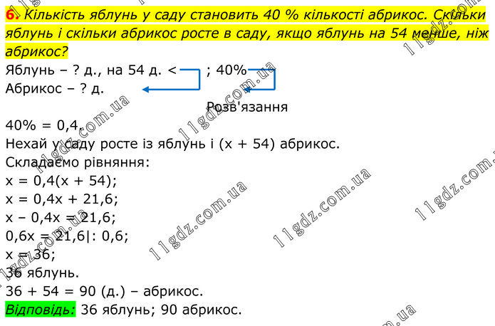 Кількість яблунь у саду становить 40 % кількості абрикос. Скільки яблунь і скільки абрикос росте в саду, якщо яблунь на 54 менше, ніж абрикос? Яблунь – ? д., на 54 д. < ; 40% Абрикос – ? д. Розв'язання 40% = 0,4. Нехай y саду росте із яблунь і (х + 54) абрикос. Складаємо рівняння: х = 0,4(х + 54); x = 0,4x + 21,6; x – 0,4x = 21,6; 0,6х = 21,6|: 0,6; х = 36; 36 яблунь. 36 + 54 = 90 (д.) – абрикос. Відповідь: 36 яблунь; 90 абрикос.