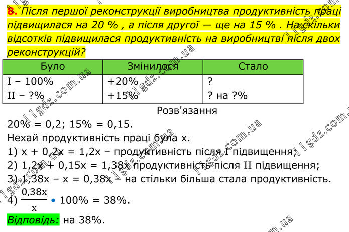 Після першої реконструкції виробництва продуктивність праці підвищилася на 20 % , а після другої — ще на 15 % . На скільки відсотків підвищилася продуктивність на виробництві після двох реконструкцій? Розв'язання 20% = 0,2; 15% = 0,15. Нехай продуктивність праці була x. 1) x + 0,2x = 1,2x – продуктивність після І підвищення; 2) 1,2x + 0,15x = 1,38x продуктивність після ІІ підвищення; 3) 1,38х – x = 0,38x – на стільки більша стала продуктивність. 4) 0,38х/х • 100% = 38%. Відповідь: на 38%.