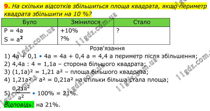 На скільки відсотків збільшиться площа квадрата, якщо периметр квадрата збільшити на 10 %? Розв'язання 1) 4а + 0,1 • 4a = 4a + 0,4 а = 4,4 а периметр після збільшення; 2) 4,4а : 4 = 1,1а – сторона більшого квадрата; 3) (1,1а)² = 1,21 а² – площа більшого квадрата; 4) 1,21а² – а² = 0,21а² на стільки більша стала площа; 5) 〖0,21а〗^2/а^2 • 100% = 21%. Відповідь: на 21%.