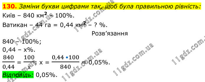 Заміни букви цифрами так, щоб була правильною рівність: Київ – 840 км2 – 100%. Ватикан – 44 га = 0,44 км2 – ? %. Розв’язання 840 – 100%; 0,44 – х%. 840/0,44 = 100/х; х = (0,44 •100)/840 ≈ 0,05%. Відповідь: 0,05%.