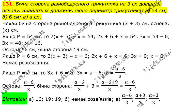 Бічна сторона рівиобедреного трикутника на 3 см довша за основу. Знайдіть їх довжини, якщо периметр трикутника: а) 54 см; б) 6 см; в) а см. Нехай бічна сторона рівнобедреного трикутника (х + 3) см, основа: (х) см. Якщо P = 54 см, то 2(х + 3) + х = 54; 2x + 6 + х = 54; Зx = 54 – 6; Зх = 48; х = 16. Основа 16 см, бічна сторона 19 см. Якщо P = 6 см, то 2(х + 3) + х = 6; 2х + 6 + х = 6; 3х = 0; х = 0. Немає розв’язання. Якщо P = а см, то Зх + 6 = а; 3x = а – 6; x = (a-6)/3. Основа: (a-6)/3; бічна сторона: (a-6)/3 + 3 = (a-6+9)/3 = (a-6)/3. Відповідь: а) 16; 19; 19; б) немає розв’язків; в) (a-6)/3; (a+3)/3; (a+3)/3.