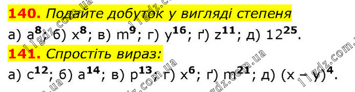 140. Подайте добуток у вигляді степеня а) а8; б) х8; в) m9; г) y16; ґ) z11; д) 1225. 141. Спростіть вираз: a) с12; б) а14; в) р13; г) х6; ґ) m21; д) (x – y)4.