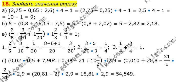 Знайдіть значення виразу а) (2,75 – 0,65 : 2,6) • 4 – 1 = (2,75 – 0,25) • 4 – 1 = 2,5 • 4 – 1 = 10 – 1 = 9; б) 5 – (0,8 + 15,15 : 7,5) = 5 – (0,8 + 2,02) = 5 – 2,82 = 2,18. в) (2/5 – 3/10 + 11/20) • 12/3 + 3/4 = 1; 1. 2/5 – 3/10 + 1/20 = (8-6+1)/20 = 3/20; 2. (3 • 5)/(20 • 3) = 1/4; 3. 1/4 + 3/4 = 1. г) (0,02 • 0,5 + 7,904 : 0,38 – 21 : 101/2) • 2,9 = (0,010 + 20,8 – 21/1 • 2/21) • 2,9 = (20,81 – 2) • 2,9 = 18,81 • 2,9 = 54,549.