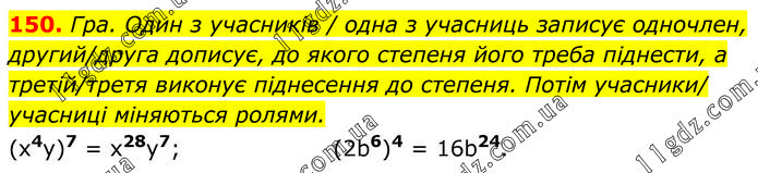 Гра. Один з учасників / одна з учасниць записує одночлен, другий/друга дописує, до якого степеня його треба піднести, а третій/третя виконує піднесення до степеня. Потім учасники/ учасниці міняються ролями. (x4y)7 = x28y7; (2b6)4 = 16b24.