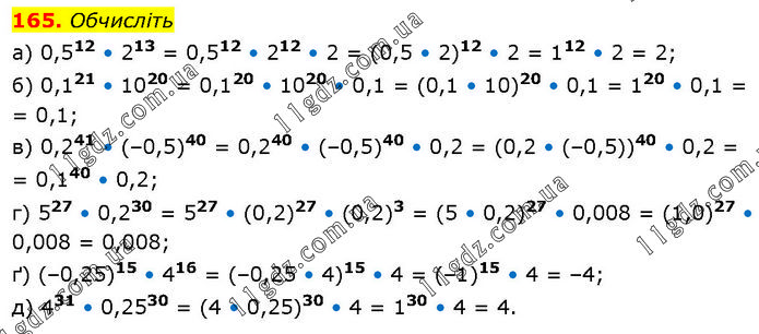 Обчисліть а) 0,512 • 213 = 0,512 • 212 • 2 = (0,5 • 2)12 • 2 = 112 • 2 = 2; б) 0,121 • 1020 = 0,120 • 1020 • 0,1 = (0,1 • 10)20 • 0,1 = 120 • 0,1 = 0,1; в) 0,241 • (–0,5)40 = 0,240 • (–0,5)40 • 0,2 = (0,2 • (–0,5))40 • 0,2 = 0,140 • 0,2; г) 527 • 0,230 = 527 • (0,2)27 • (0,2)3 = (5 • 0,2)27 • 0,008 = (1,0)27 • 0,008 = 0,008; ґ) (–0,25)15 • 416 = (–0,25 • 4)15 • 4 = (–1)15 • 4 = –4; д) 431 • 0,2530 = (4 • 0,25)30 • 4 = 130 • 4 = 4.