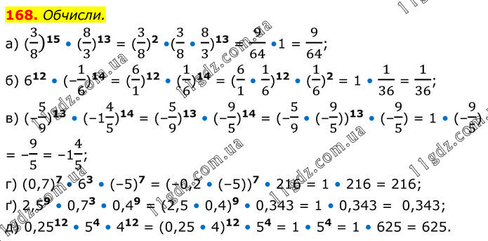 Обчисли. а) (3/8)15 • (8/3)13 = (3/8)2 •(3/8 • 8/3)13 = 9/64 •1 = 9/64; б) 612 • (–1/6)14 = (6/1)12 • (1/6)14 = (6/1 • 1/6)12 • (1/6)2 = 1 • 1/36 = 1/36; в) (–5/9)13 • (–14/5)14 = (–5/9)13 • (–9/5)14 = (–5/9 • (–9/5))13 • (–9/5) = 1 • (–9/5) = –9/5 = –14/5; г) (0,7)7 • 63 • (–5)7 = (–0,2 • (–5))7 • 216 = 1 • 216 = 216; ґ) 2,59 • 0,73 • 0,49 = (2,5 • 0,4)9 • 0,343 = 1 • 0,343 = 0,343; д) 0,2512 • 54 • 412 = (0,25 • 4)12 • 54 = 1 • 54 = 1 • 625 = 625.