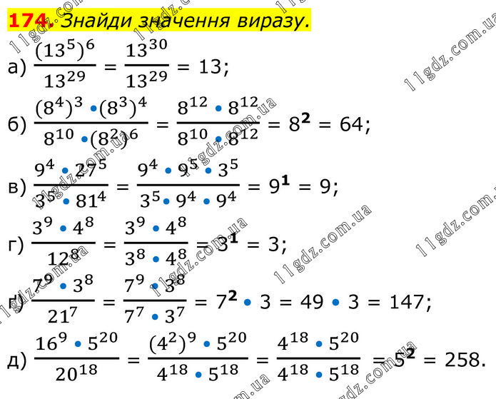 Знайди значення виразу. а) ((13^5 )^6)/13^29 = 13^30/13^29 = 13; б) ((8^4 )^3 •(8^3 )^4)/(8^10 •(8^2 )^6 ) = (8^12 • 8^12)/(8^10 • 8^12 ) = 82 = 64; в) (9^4 • 27^5)/(3^5 • 81^4 ) = (9^4 • 9^5 • 3^5)/(3^5• 9^4 • 9^4 ) = 91 = 9; г) (3^9 • 4^8)/12^8 = (3^9 • 4^8)/(3^8 • 4^8 ) = 31 = 3; ґ) (7^9 • 3^8)/21^7 = (7^9 • 3^8)/(7^7 • 3^7 ) = 72 • 3 = 49 • 3 = 147; д) (16^9 • 5^20)/20^18 = ((4^2 )^9 • 5^20)/(4^18 • 5^18 ) = (4^18 • 5^20)/(4^18 • 5^18 ) = 52 = 258.