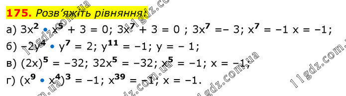 Розв’яжіть рівняння: а) Зх2 • х5 + 3 = 0; 3х7 + 3 = 0 ; 3х7 =– 3; х7 = –1 х = –1; б) –2у4 • у7 = 2; у11 = –1; у = – 1; в) (2x)5 = –32; 32x5 = –32; x5 = –1; x = –1; г) (x9 • x4)3 = –1; x39 = –1; х = –1.