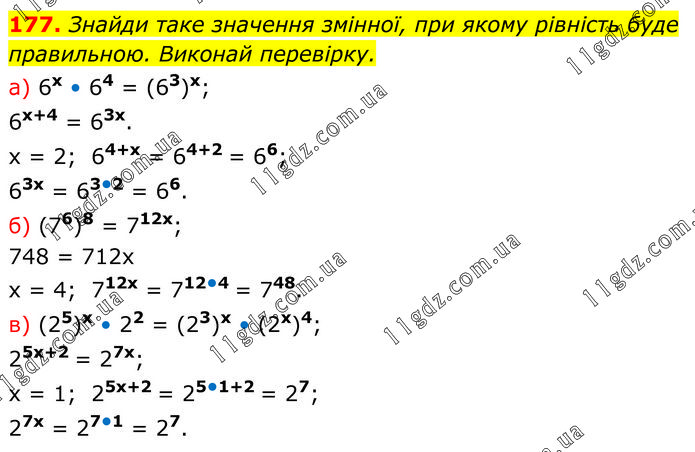 Знайди таке значення змінної, при якому рівність буде правильною. Виконай перевірку. а) 6х • 64 = (63)х; 6х+4 = 63х. х = 2; 64+х = 64+2 = 66; 63х = 63•2 = 66. б) (76)8 = 712х; 748 = 712х х = 4; 712х = 712•4 = 748. в) (25)х • 22 = (23)х • (2х)4; 25х+2 = 27х; х = 1; 25х+2 = 25•1+2 = 27; 27х = 27•1 = 27.