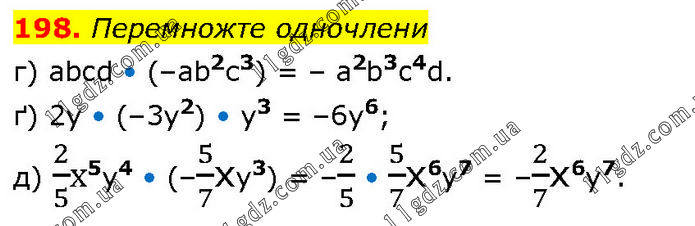 Перемножте одночлени г) abcd • (–аb2с3) = – a2b3c4d. ґ) 2у • (–3y2) • у3 = –6y6; д) 2/5x5y4 • (–5/7xy3) = –2/5 • 5/7x6y7 = –2/7x6y7.