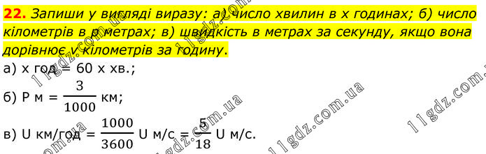 Запиши у вигляді виразу: а) число хвилин в х годинах; б) число кілометрів в р метрах; в) швидкість в метрах за секунду, якщо вона дорівнює v кілометрів за годину. а) х год = 60 х хв.; б) Р м = З/1000 км; в) U км/год = 1000/3600 U м/с = 5/18 U м/с.