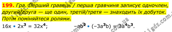 Перший гравець / перша гравчиня записує одночлен, другий/друга — ще один, третій/третя — знаходить їх добуток. Потім поміняйтеся ролями. 16х • 2х3 = 32х4; –ab2 • (–3a3b) = 3a4b3.
