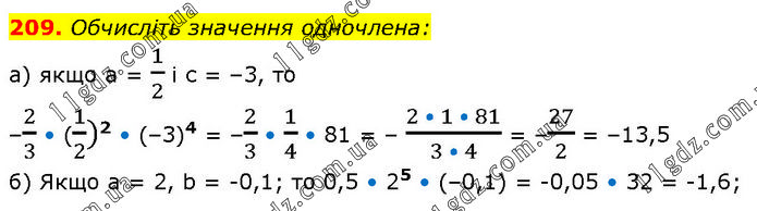 Обчисліть значення одночлена: а) якщо а = 1/2 і с = –3, то –2/3 • (1/2)2 • (–3)4 = –2/3 • 1/4 • 81 = – (2 • 1 • 81)/(3 • 4) = –27/2 = –13,5 б) Якщо а = 2, b = -0,1; то 0,5 • 25 • (–0,1) = -0,05 • 32 = -1,6;