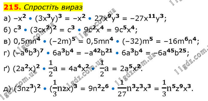 Спростіть вираз а) –x2 • (3x3y)3 = –x2 • 27x9y3 = –27x11y3; б) c3 • (3cx2)2 = c3 • 9c2x4 = 9c5x4; в) 0,5mn4 • (–2m)5 = 0,5mn4 • (–32)m5 = –16m6n4; г) (–a6b3)7 • 6a3b4 = –a42b21 • 6a3b4 = –6a45b25; ґ) (2a2x)2 • 1/2a = 4a4x2 • 1/2a = 2a5x2. д) (3nz3)2 • (1/3nzx)3 = 9n2z6 • 1/27n3z3x3 = 1/3n5z9x3.