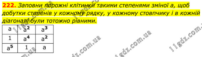 Заповни порожні клітинки такими степенями зміної a, щоб добутки степенів у кожному рядку, у кожному стовпчику і в кожній діагоналі були тотожно рівними.