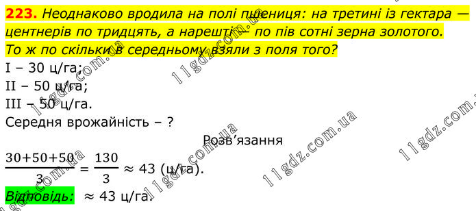 Неоднаково вродила на полі пшениця: на третині із гектара — центнерів по тридцять, а нарешті — по пів сотні зерна золотого. То ж по скільки в середньому взяли з поля того? І – 30 ц/га; ІІ – 50 ц/га; ІІІ – 50 ц/га. Середня врожайність – ? Розв’язання (30+50+50)/3 = 130/3 ≈ 43 (ц/га). Відповідь: ≈ 43 ц/га.