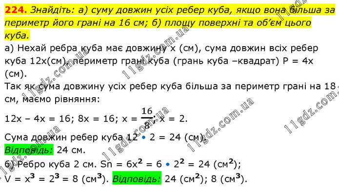 Знайдіть: а) суму довжин усіх ребер куба, якщо вона більша за периметр його грані на 16 см; б) площу поверхні та об’єм цього куба. а) Нехай ребра куба має довжину х (см), сума довжин всіх ребер куба 12х(см), периметр грані куба (грань куба –квадрат) P = 4x (см). Так як сума довжину усіх ребер куба більша за периметр грані на 18 см, маємо рівняння: 12х – 4х = 16; 8х = 16; х = 16/8; х = 2. Сума довжин ребер куба 12 • 2 = 24 (см). Відповідь: 24 см. б) Ребро куба 2 см. Sn = 6х2 = 6 • 22 = 24 (см2); V = х3 = 23 = 8 (см3). Відповідь: 24 (см2); 8 (см3).