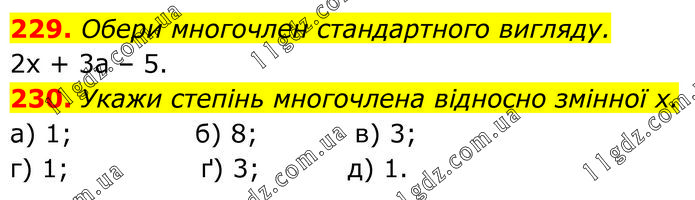 229. Обери многочлен стандартного вигляду. 2х + 3а – 5. 230. Укажи степінь многочлена відносно змінної х. а) 1; б) 8; в) 3; г) 1; ґ) 3; д) 1.