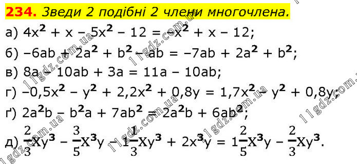 3веди 2 подiбнi 2 члени многочлена. а) 4x2 + x – 5x2 – 12 = –x2 + x – 12; б) –6аb + 2а2 + b2 – аb = –7ab + 2а2 + b2; в) 8а – 10аb + За = 11а – 10ab; г) –0,5x2 – у2 + 2,2х2 + 0,8у = 1,7x2 – у2 + 0,8у; ґ) 2a2b – b2a + 7ab2 = 2а2b + 6аb2; д) 2/3ху3 – 3/5х3у – 11/3ху3 + 2х3у = 12/5х3у – 2/3ху3.