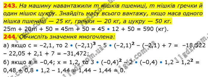 243. На машину навантажили m мішків пшениці, m мішків гречки й один мішок цукру. Знайдіть масу всього вантажу, якщо маса одного мішка пшениці — 25 кг, гречки — 20 кг, а цукру — 50 кг. 25m + 20m + 50 = 45m + 50 = 45 • 12 + 50 = 590 (кг). 244. Обчисліть значення многочлена: а) якщо с = –2,1, то 2 • (–2,1)3 – 5 • (–2,1)2 – (–2,1) + 7 = –18,522 – 22,05 + 2,1 + 7 = –31,472; б) якщо а = –0,4; x = 1,2, то 3 • (–0,4)2 – 2 • (–0,4) • 1,2 – 1,22 = 0,48 + 0,8 • 1,2 – 1,44 = 1,44 – 1,44 = 0.