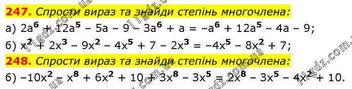 247. Спрости вираз та знайди степiнь многочлена: а) 2а6 + 12а5 – 5а – 9 – За6 + а = –а6 + 12а5 – 4а – 9; б) x2 + 2x3 – 9х2 – 4x5 + 7 – 2x3 = –4x5 – 8х2 + 7; 248. Спрости вираз та знайди степiнь многочлена: б) –10x2 – x8 + 6х2 + 10 + Зx8 – Зх5 = 2х8 – Зх5 – 4х2 + 10.