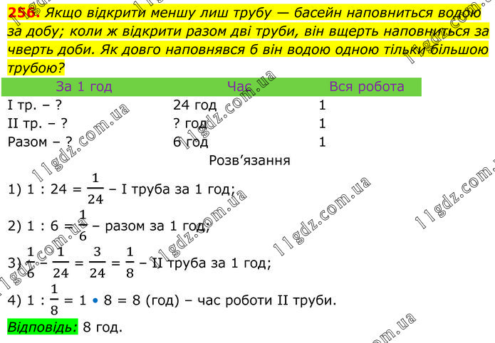 Якщо відкрити меншу лиш трубу — басейн наповниться водою за добу; коли ж відкрити разом дві труби, він вщерть наповниться за чверть доби. Як довго наповнявся б він водою одною тільки більшою трубою? 1) 1 : 24 = 1/24 – І труба за 1 год; 2) 1 : 6 = 1/6 – разом за 1 год; 3) 1/6 – 1/24 = 3/24 = 1/8 – ІІ труба за 1 год; 4) 1 : 1/8 = 1 • 8 = 8 (год) – час роботи ІІ труби. Відповідь: 8 год.